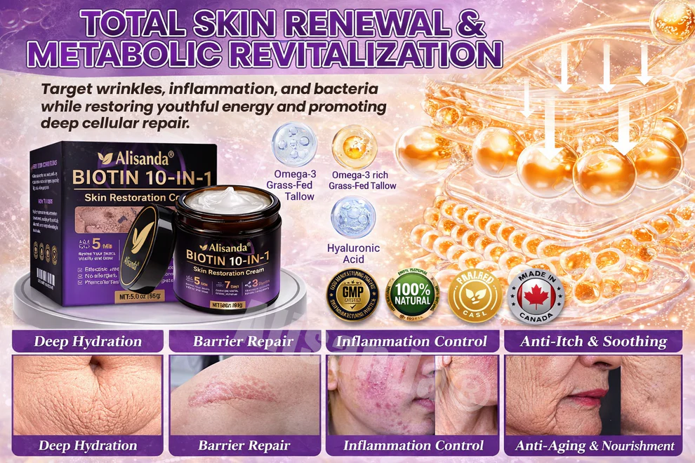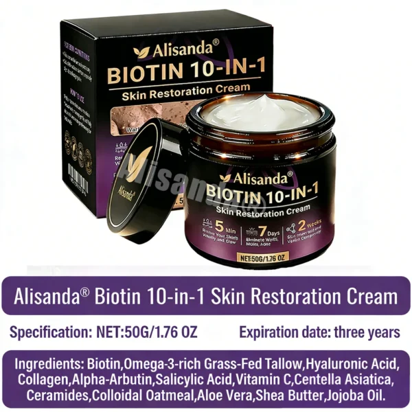 Alisanda Biotin 10-in-1 Skin Restoration Cream supports hydration, firmness, and brighter skin with a multi-action daily formula