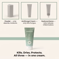 Powders absorb moisture but don’t address infection. Antifungal creams target fungus but leave bacteria untreated and do nothing to reduce friction. Hydrocortisone calms inflammation temporarily — but over time it thins the skin barrier and can actually worsen fungal overgrowth. Most conventional intertrigo products pick one pathway and ignore the others, which is precisely why the redness, burning, and discomfort keep returning the moment you stop using them.