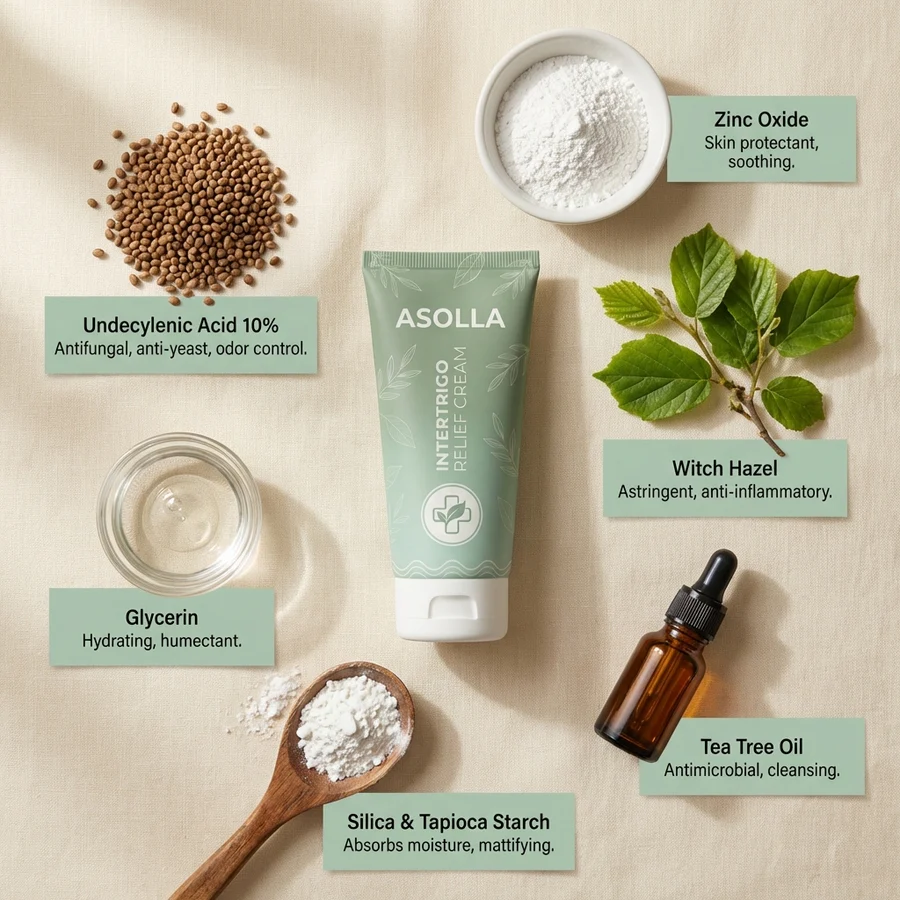 Undecylenic Acid is a well-studied, naturally derived antifungal compound that works at the source — eliminating the fungal overgrowth that drives the persistent redness and itching of intertrigo without the skin-thinning risks associated with prolonged steroid use.