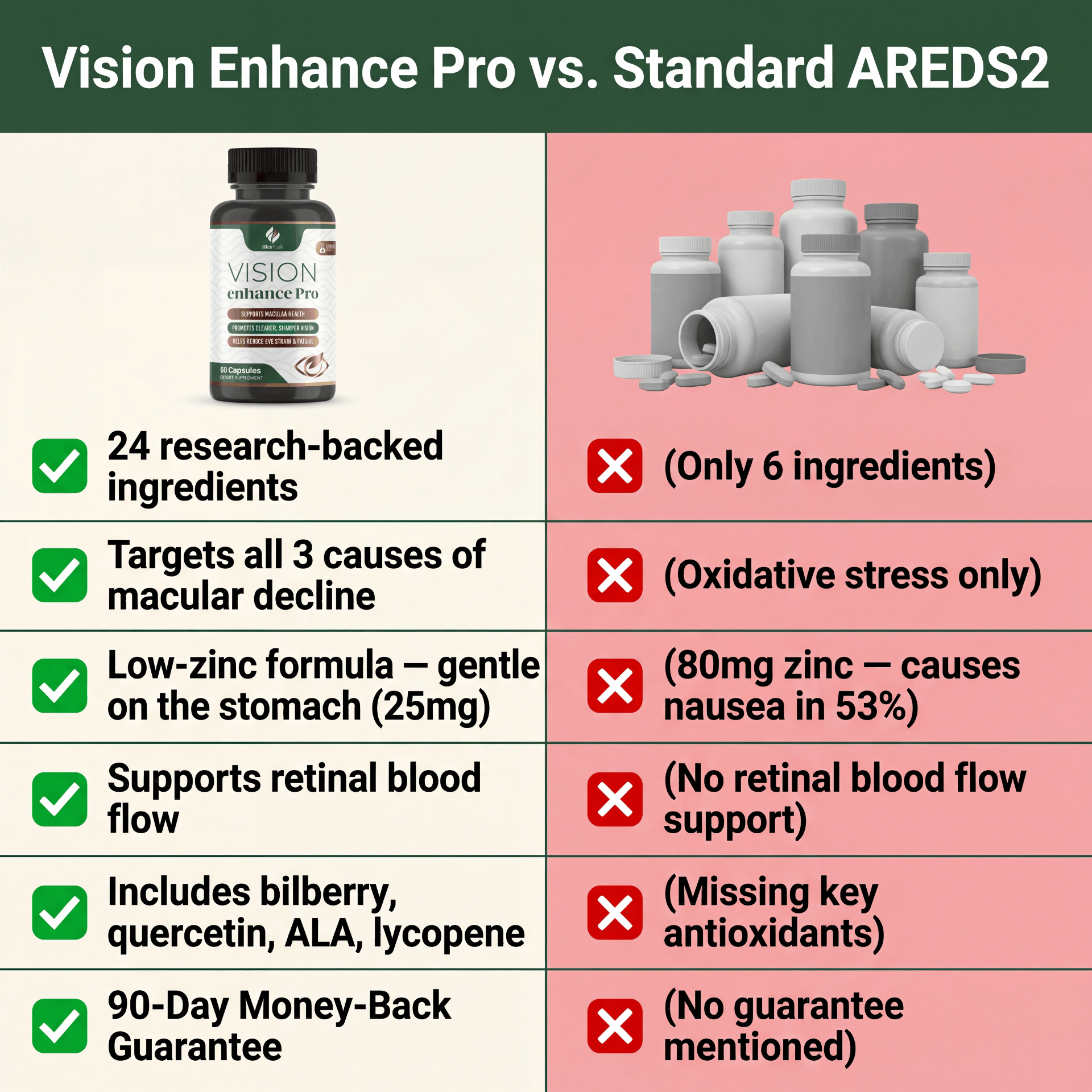 AREDS2 was a landmark development in eye health nutrition — but it addresses only one of the three root causes of macular degeneration. Nearly all generic eye supplements available today are repackaged versions of the same six-ingredient formula, with the same gaps. Unlike many ordinary eye supplements on the market that rely on this outdated single-pathway approach, Vision Enhance Pro was formulated specifically to go further.
