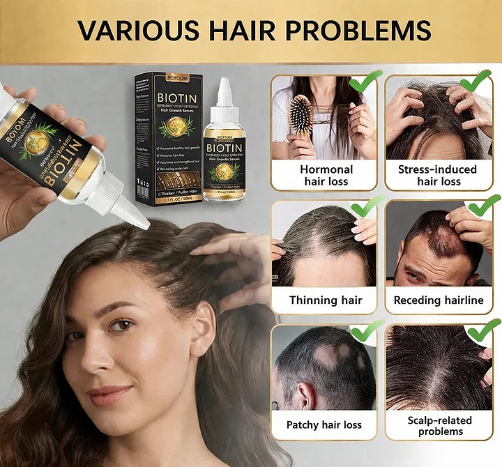BQYOOM® Biotin & Rosemary Hair Growth Serum supports thicker, stronger hair with scalp circulation, DHT defence, and follicle activation