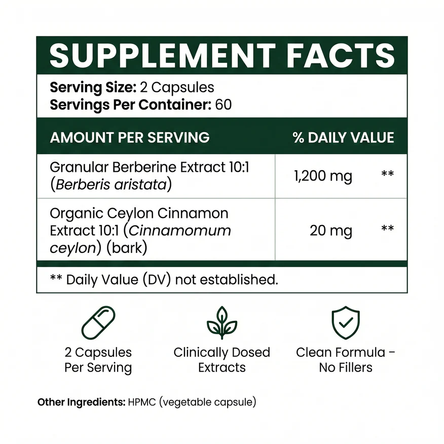 1,200mg berberine extracted from 12,000mg raw root for clinically meaningful potency Supports stable blood sugar levels to reduce the spike-and-crash craving cycle Organic Ceylon Cinnamon addresses glucose entry rate alongside cellular response Gentle on the stomach and produced in a GMP-certified, FDA-registered US facility A highly sought-after metabolic wellness formula loved by over 45,000 customers worldwide