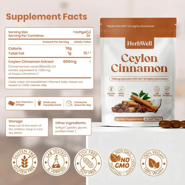 Is HerbWell suitable for long-term daily use? Yes — the coumarin-free Ceylon cinnamon formula and clean softgel format are specifically designed for safe, consistent long-term daily supplementation. If you are managing a health condition or taking medication, always consult your healthcare professional before use.