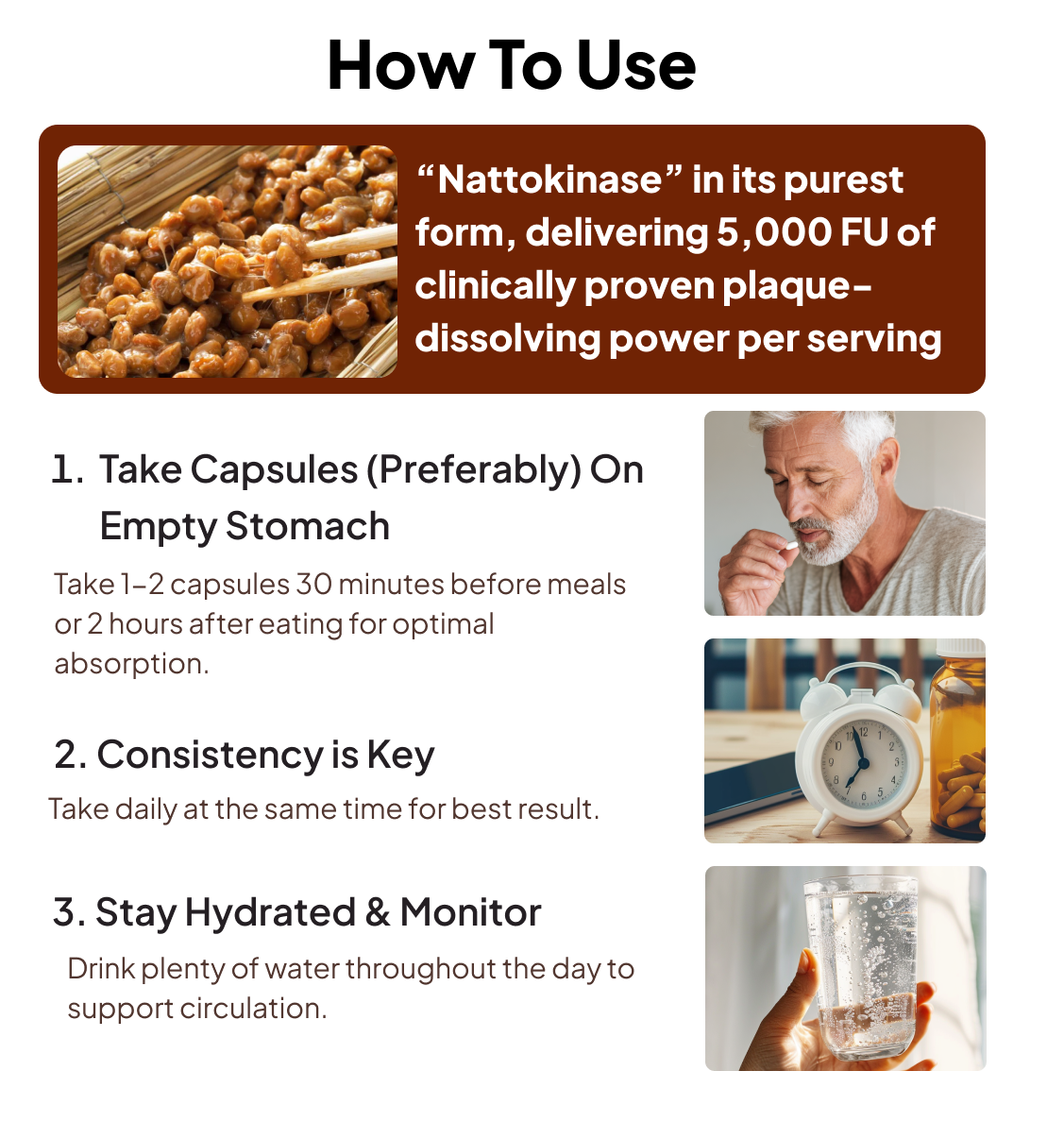 Step 1 — Take one to two capsules daily with water as directed on the product packaging. Step 2 — Take on an empty stomach or between meals for optimal enzymatic absorption and activity. Step 3 — Use consistently every day — nattokinase delivers its strongest compounding cardiovascular benefits with uninterrupted daily use over weeks and months.