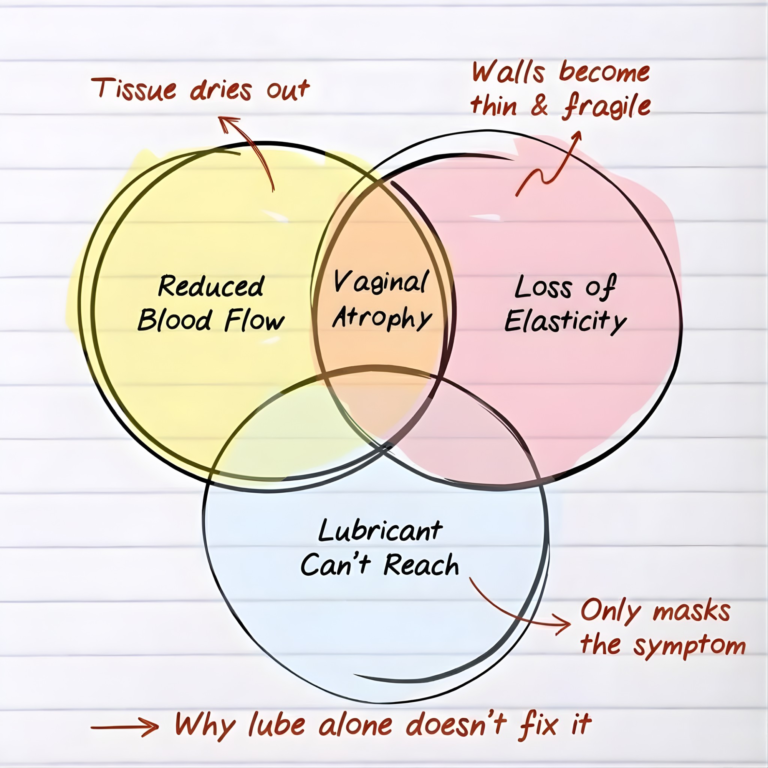 “Second, less blood flow means your tissue loses elasticity.” The walls become thinner. More fragile. More prone to discomfort.