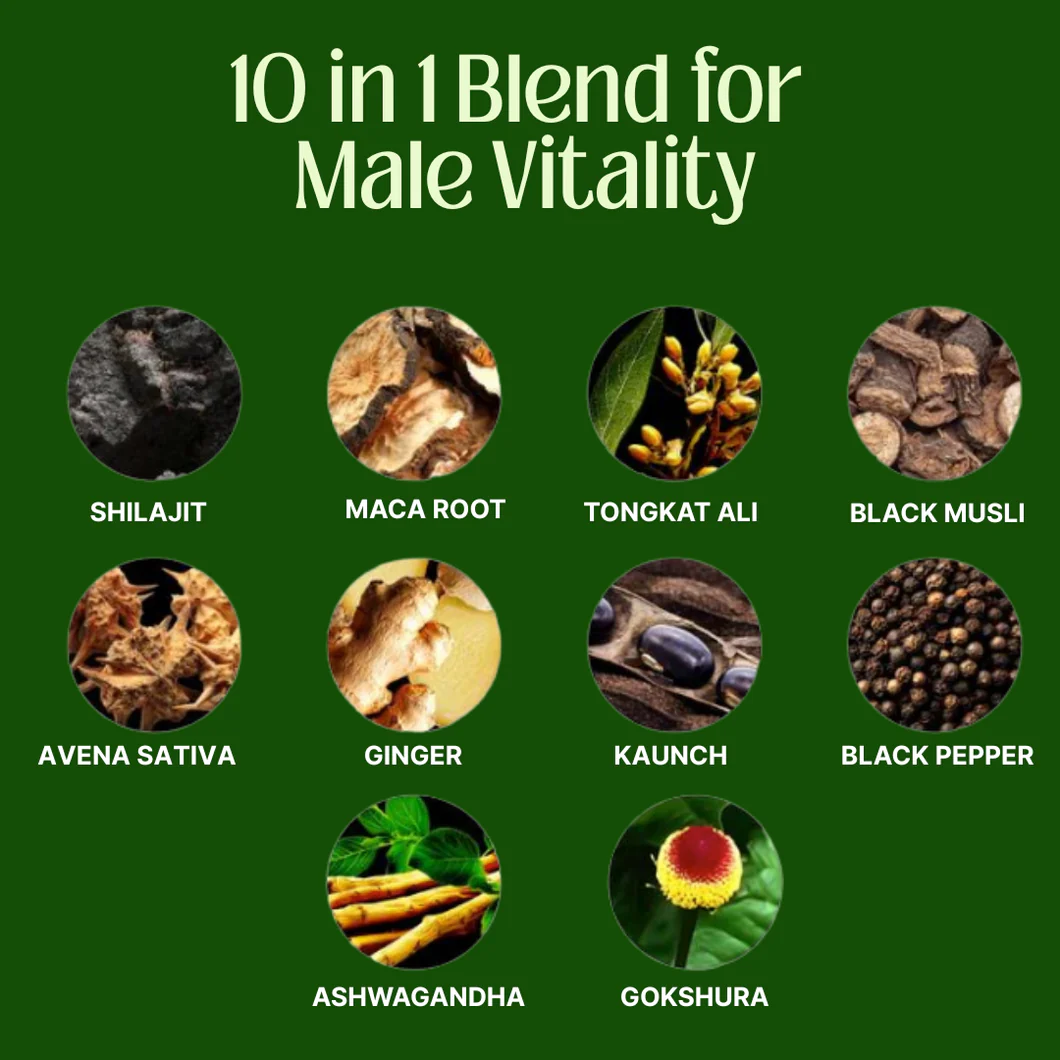Highest Quality Shilajit — purified using a low-stress, water-based process that preserves fulvic acid integrity and over 85 trace minerals without the heat and chemical extraction that destroys potency in most products. Clinically studied to support healthy testosterone production and cellular energy through mitochondrial support. KSM-66 Ashwagandha — the most bioavailable and researched form of ashwagandha, supporting healthy stress response, physical strength, endurance, and mental clarity. Tongkat Ali — supports hormonal balance, overall male wellness, and physical performance through natural testosterone pathway support. Black Pepper Extract — enhances bioavailability of every other active ingredient in the formula, ensuring nothing is wasted before it reaches your cells. Ginger — supports healthy circulation, blood flow, and antioxidant protection for recovery and overall male wellness. Maca Root — promotes sustained, caffeine-free energy, mood resilience, and endurance. Black Musli — traditionally valued for supporting vitality, stamina, and natural energy levels. Gokshura — supports active physical performance and recovery during demanding days. Mucuna Pruriens — supports dopamine production directly linked to motivation, mood, confidence, and sexual desire. Avena Sativa — traditionally used to support stamina, endurance, and healthy energy levels without overstimulation.
