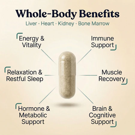 Grass-fed beef liver, heart, kidney, and bone marrow deliver whole food ancestral nutrition CoQ10 from beef heart and retinol from liver support cellular energy and immune function Magnesium Glycinate and Zinc Picolinate support sleep quality, hormone balance, and recovery Piperine enhances bioavailability of all active nutrients throughout the complete formula A highly sought-after ancestral nutrition supplement loved by our customers worldwide